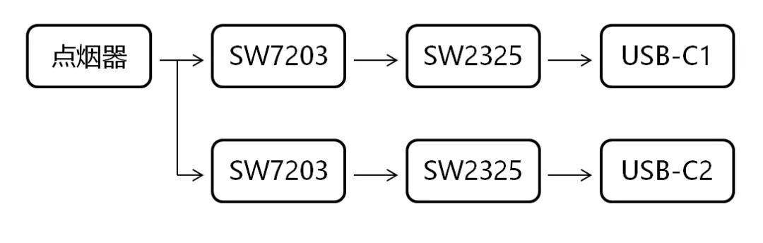 智融雙口100W車充方案同樣可以使用智融SW7203+SW2325/SW2305設計,可實現單口最高輸出功率100W,同時支持雙口功率盲插,并且支持輸出功率智能分配功能。SW2325/SW2305支持所有通用快充協(xié)議及大部分私有協(xié)議,并且支持USB-C口升級協(xié)議功能。