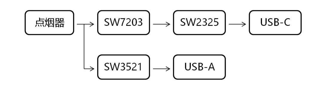 雙獨立輸出的130W 1A1C雙口車充方案,可以采用SW7203+SW2325/SW2305實現C口100W輸出,另外一路A口采用SW3522內置開關管的全集成降壓轉換器實現高集成的A口30W輸出。殼實現雙口真正獨立快充,而不會雙口輸出時降為5V。