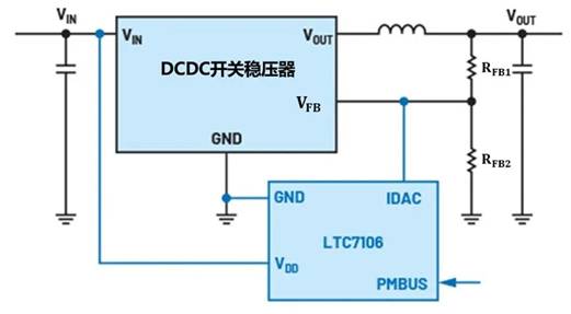 我們以ADI的DAC LTC7106舉例:如下圖,LTC7106向電阻分壓電路輸出一個電流,使得DCDC開關(guān)穩(wěn)壓器反饋引腳上的電壓改變,從而使得DC-DC開關(guān)穩(wěn)壓器輸出電壓可以根據(jù)數(shù)字控制信號而改變。