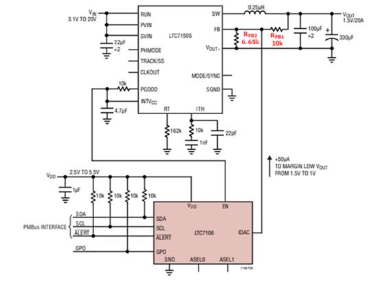 如下圖,使用LTC7150S作為DC-DC開關(guān)穩(wěn)壓器,提供1.5V電壓輸出。假設(shè)我們現(xiàn)在需要電源在1.5V到1.0V之間對電源輸出電壓進(jìn)行動態(tài)調(diào)整。