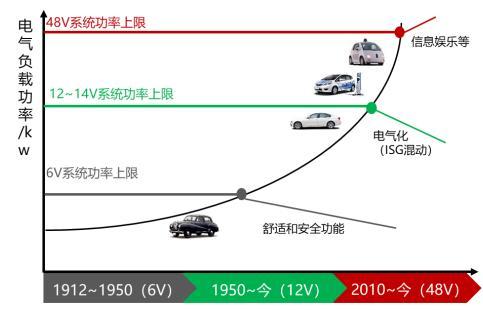 在電動車出現(xiàn)以前,汽車中的電壓都是非常低的。回顧燃油汽車的發(fā)展歷史來看,自1912年起至今的一百多年間,燃油車的功率僅從6V上升到了48V,