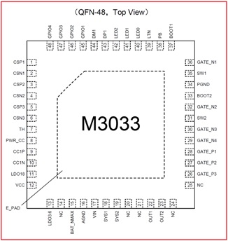M3033 是一款電源管理 SOC,集成了單指令周期的高性能微處理器(MCU)、16-bit 高精度模/數(shù)轉(zhuǎn)換單元(SD-ADC)、Buck-Boost 控制單元、MOSFET 驅(qū)動(dòng)接口、LED 直接驅(qū)動(dòng)接口,以及多種安全保護(hù)機(jī)制。M3033支持 PD2.0、QC2.0 快充協(xié)議,配合少許外圍電路,即可組成 2-7 串電池的充電管理解決方案。采用QFN-48封裝。