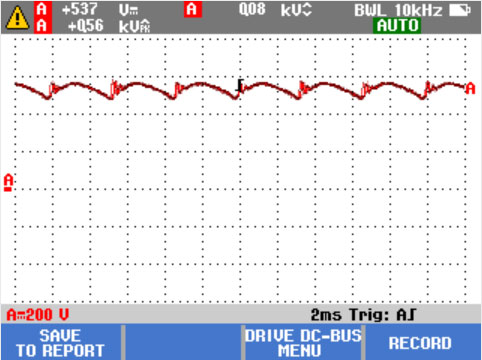 驅(qū)動(dòng)器內(nèi)部的交流-直流轉(zhuǎn)換至關(guān)重要。為獲得最佳驅(qū)動(dòng)器性能,必須要保證電壓正確、充分濾波并保持低紋波水平。高波紋電壓可能說明電容器存在故障或所連接電機(jī)的規(guī)格不正確。Fluke MDA-500 系列 Motor Drive Analyzer 的記錄功能可在承受負(fù)載時(shí)的工作模式下對直流總線的性能進(jìn)行動(dòng)態(tài)檢查。還可以使用 Fluke ScopeMeter® Test Tool 或高級萬用表進(jìn)行此測試。