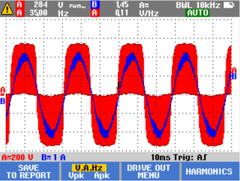 · 使用相間測量檢查電壓調(diào)制。高電壓峰值可能會(huì)損壞電機(jī)繞組絕緣并導(dǎo)致驅(qū)動(dòng)器跳閘。電壓峰值超過標(biāo)稱電壓 50% 以上會(huì)產(chǎn)生問題。