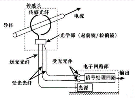 激光束通過光纖,并經(jīng)起偏器產(chǎn)生偏振光,經(jīng)自聚焦透鏡人射到磁光晶體:在電流產(chǎn)生的外磁場(chǎng)作用下,偏振面旋轉(zhuǎn)θF角度;經(jīng)過檢偏器、光纖,進(jìn)人信號(hào)檢測(cè)系統(tǒng),通過對(duì)θF的測(cè)量得到電流值。