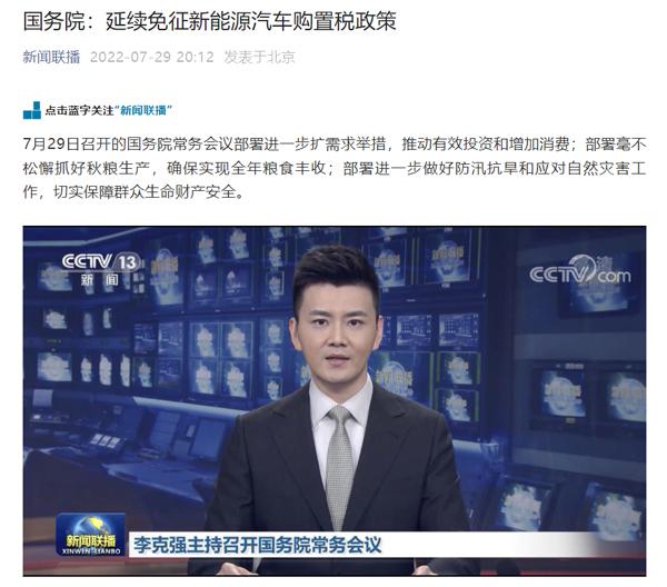 據(jù)新聞聯(lián)播官微消息,7 月 29 日召開的國務院常務會議指出,除個別地區(qū)外,限購地區(qū)要增加汽車指標數(shù)量、放寬購車資格限制。打通二手車流通堵點。延續(xù)免征新能源汽車購置稅政策。