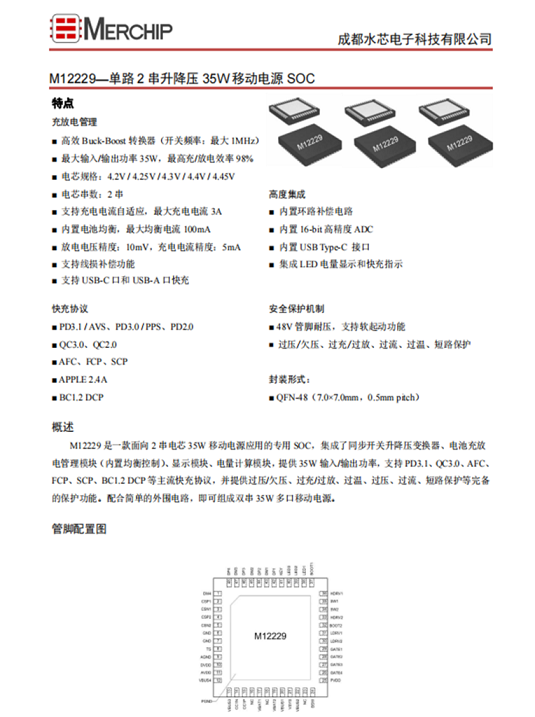水芯 M12229 作為一款面向2串電芯35W移動電源應(yīng)用的專用SOC,集成了同步開關(guān)升降壓變換器、電池充放電管理模塊(內(nèi)置均衡控制)、顯示模塊、電量計算模塊,提供35W輸入/輸出功率。