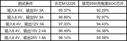 上圖為水芯 M12229 在 8.4V 輸入時,輸出5V、9V、12V、15V、20V的輸出效率曲線。水芯 M12229 刷新了35W升降壓充電寶的效率記錄。由于集成了高效率的DC-DC電壓變換器和多種補(bǔ)償電路,M12229的最大放電效率可達(dá)97%+,比競品方案高3%以上,效率表現(xiàn)業(yè)界領(lǐng)先。