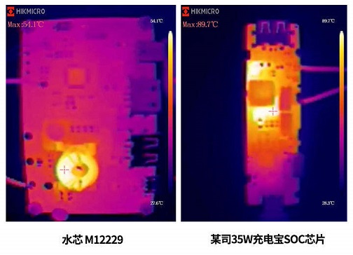 下圖為水芯 M12229 與某司35W充電寶SOC芯片的熱成像對比圖,某司35W充電寶SOC芯片輸出35W的最低輸入電壓為6.3V(放電截止電壓精度不準(zhǔn)),因此6.3V輸出15V2.33A的溫度,溫度高達(dá)89.7℃。