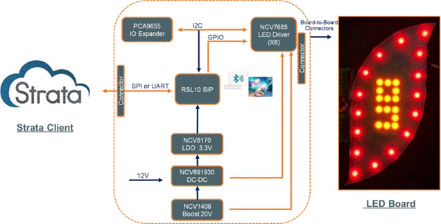 NCV7685芯片來驅(qū)動總共72個LED節(jié)點,以實現(xiàn)具有可配置參數(shù)和自定義模式的預(yù)定義動畫——所有設(shè)置和電路監(jiān)控均可通過Strata訪問。