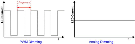 在PWM dimming狀態(tài)下,LED亮度會(huì)有”亮“、”暗”兩個(gè)狀態(tài),不同PWM duty下可以呈現(xiàn)出不同的亮度,當(dāng)PWM dimming的頻率過(guò)低的時(shí)候會(huì)出現(xiàn)頻閃(Flicker)問(wèn)題。采用analog dimming的話(huà)LED會(huì)恒亮,在dimming過(guò)程中IC只會(huì)改變輸出電流值,LED亮度也會(huì)跟著改變,不會(huì)有頻閃(Flicker)問(wèn)題。