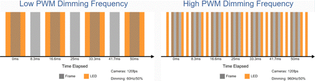 如上圖攝影機(jī)在某些影格(Frame)里面是沒(méi)有亮燈的情況,顯示在影片畫(huà)面上會(huì)出現(xiàn)所謂的頻閃現(xiàn)象(Flicker)。