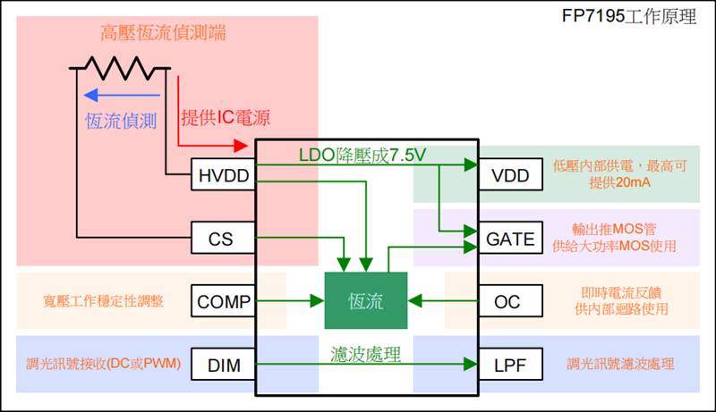 FP7195最大占空比可達(dá)100%,所以在操作時(shí)候輸入電壓可以幾乎等于LED電壓(電路元件會(huì)有壓降・所以不會(huì)輸人電壓等于ED電壓)・當(dāng)輸入電壓低于LED電壓后FP7195會(huì)讓MOS全開(kāi)・當(dāng)輸入電壓掉低于LED電壓后輸出しED電流會(huì)跟著往下降。一旦輸入電壓高于LED電壓后可馬上回復(fù)正常恒流輸出。