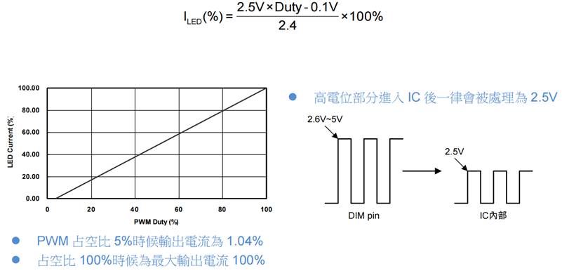 模擬調(diào)光 FP7195 同時(shí)也支援模擬調(diào)光(DC 調(diào)光),只要在 DIM 腳輸入 0.1~2.5V,即可控制輸出電流 0.1%~100%(參考電壓 0.1mV~100mV)。DIM 腳電壓(VDIM)與電流百分比(ILED(%))換算式如下: