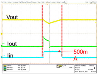 圖3. 輸入平均電流限流功能(測(cè)試條件:Vin=5V; Vout=12V; Ilimit=0.5A)