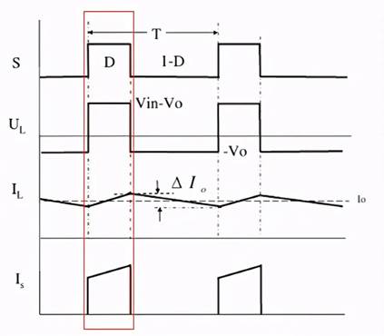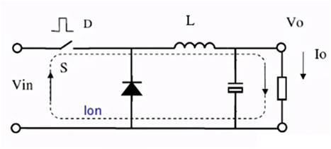 當開關(guān)導通時:輸入電壓Vin加到LC濾波器的輸入端,電感上的電流以固定斜率線性上升。如下圖