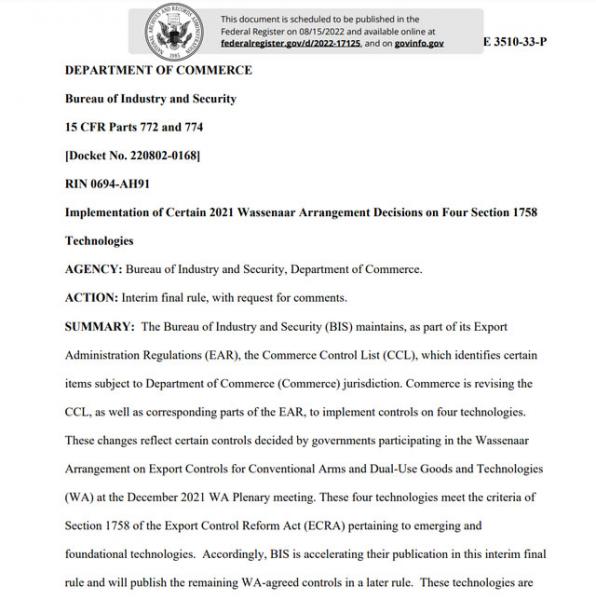 根據(jù)公報(bào), 美國工業(yè)與安全局決定對(duì)《商務(wù)部管制清單》(CCL)和《出口管理?xiàng)l例》(EAR)同步實(shí)施修訂,對(duì)四項(xiàng)技術(shù)實(shí)施管制。