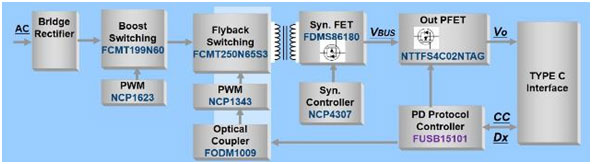 由于電源輸出功率在75W以上,就需要在電路設計中增加PFC電路來達到高功率因數(shù)下的行業(yè)標準。因此,本方案除了采用onsemi旗下新一代QR Flyback控制器NCP1343外,還在電路前級使用onsemi NCP1623作為PFC級的控制,提高了設計需求。并在輸出控制級增加onsemi FUSE15101的設計滿足了PD3.0/PPS協(xié)議標準。