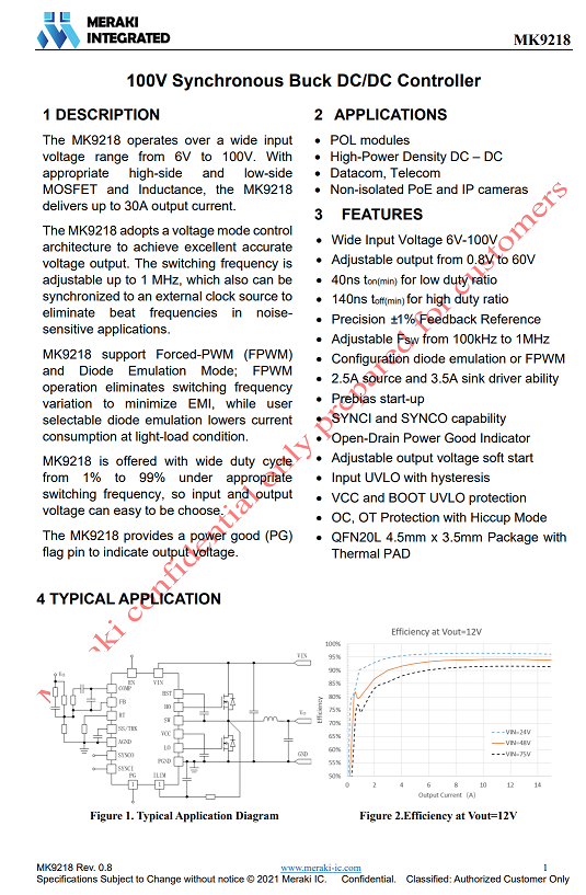 MK9218可用于負(fù)載點(diǎn)模塊,高功率密度直流電壓轉(zhuǎn)換,數(shù)據(jù)和電信應(yīng)用,非隔離PoE和網(wǎng)絡(luò)攝像頭等高壓降壓應(yīng)用。得益于高壓輸入,非常適合應(yīng)用在USB PD3.1充電器以及相關(guān)的降壓應(yīng)用場合,提供高輸入耐壓,高效率的電壓轉(zhuǎn)換。 |