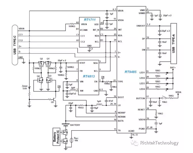 其中的 RT9485 是一款獨立的移動電源芯片(現(xiàn)在沒有對外銷售),可以 Buck 模式為電池充電,也可以 Boost 模式為外部設(shè)備供電,內(nèi)含 MCU 可以操控所有的事情。當(dāng)需要通過 USB Type-C 接口對外供電的時候,Boost 轉(zhuǎn)換器 RT4813 進(jìn)入工作狀態(tài),其輸出用電子開關(guān)接入 VBUS,完成對外供電的功能。RT1711 是 USB Type-C 接口控制器和 PD 協(xié)議處理器,它是使得這樣組合起來的系統(tǒng)能符合 PD 標(biāo)準(zhǔn)要求的必要部分。整個系統(tǒng)的電路如下圖所示: