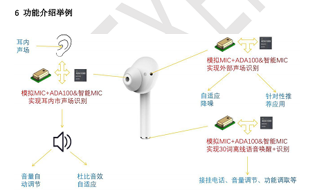 將麥克風(fēng)的模擬mic與ADA100相結(jié)合可以對(duì)于耳內(nèi)的聲場(chǎng)進(jìn)行識(shí)別,從而實(shí)現(xiàn)音量和音效的自適應(yīng)調(diào)節(jié);對(duì)于外部聲場(chǎng)也能進(jìn)行識(shí)別,從而做出自適應(yīng)降噪,降低降噪消耗的功耗,提升續(xù)航時(shí)間;ADA100還擁有30個(gè)關(guān)鍵詞的識(shí)別,可以通過(guò)語(yǔ)音控制來(lái)進(jìn)行電話的接掛、音量大小的調(diào)控、音樂(lè)的切換等人機(jī)交互功能,更加的快速便捷。