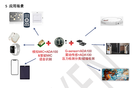 ADA100搭配麥克風(fēng)可以應(yīng)用到許多智能設(shè)備上,例如TWS耳機(jī)、智能手環(huán)、手機(jī)和平板電腦的人工智能助手、智能遙控器、智能開(kāi)關(guān)、智能家居等,使用場(chǎng)景相當(dāng)廣泛。