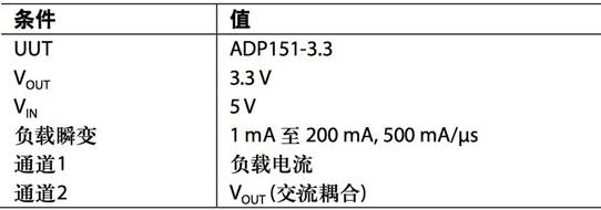 因為LDO控制環(huán)路的帶寬有限,因此輸出電容必須提供快速瞬變所需的大多數負載電流。1μF電容無法持續(xù)很長時間供應電流并產生約80mV的負載瞬變。10μF電容將負載瞬變降低至約70mV。將輸出電容提高至20μF,LDO控制回路就可捕捉并主動降低負載瞬變。測試條件如表1所示。