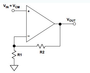 CMRR可以在配置在同相放大器中的運(yùn)算放大器中建立并聯(lián)失調(diào)電壓,如下圖所示。同相運(yùn)算放大器會(huì)有少量CMRR誤差,因?yàn)閮蓚(gè)輸入都接地,不存在CM動(dòng)態(tài)電壓。