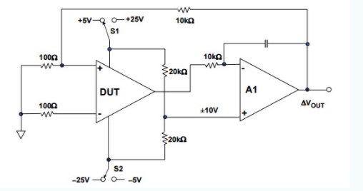 與上述電路相比,以下電路更為復(fù)雜,無需使用精密電阻即可測(cè)量CMRR。通過切換電源電壓來改變共模抑制比。實(shí)際上,該電路可以很容易地實(shí)現(xiàn),并且通過使用相同的電路,可以應(yīng)用不同的電源電壓來測(cè)量電源抑制比。