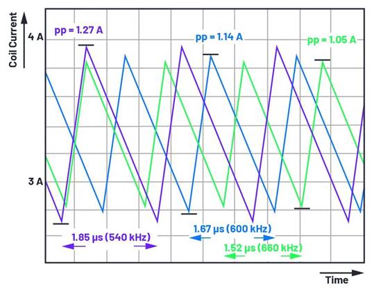 圖 2. 受開(kāi)關(guān)頻率變化影響的峰到峰線圈電流紋波