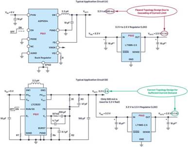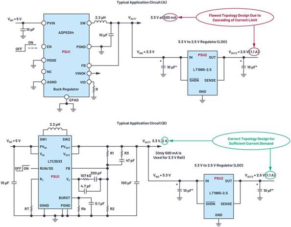 退出級(jí)聯(lián)階段時(shí),要避免限流情況。圖2所示為一個(gè)典型的級(jí)聯(lián)應(yīng)用:(A) 顯示由產(chǎn)生3.3 V電源,電流500 mA的ADP5304 降壓 穩(wěn)壓器(PSU1)構(gòu)成的設(shè)計(jì)。為了提高效率,設(shè)計(jì)人員應(yīng)分接3.3 V電軌,而不是5 V輸入電源。3.3 V輸出被進(jìn)一步切斷,以為PSU2 (LT1965)供電,這款LDO穩(wěn)壓器用于進(jìn)一步將電壓降低至2.5 V,且按照板載2.5 V電路和IC的要求,將輸出電流限制在1.1 A。