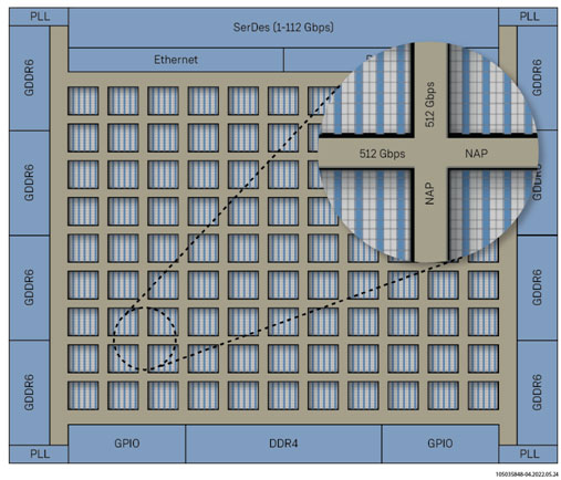 隨后這些數(shù)據(jù)進入到Speedster7t的二維片上網(wǎng)絡(luò)(2D NoC)。該二維片上網(wǎng)絡(luò)是Speedster7t架構(gòu)中的另一種硬結(jié)構(gòu),時鐘頻率高達2 GHz,可與所有I/O、內(nèi)部硬模塊和FPGA邏輯陣列本身互連。憑借20 Tbps的總帶寬,2D NoC提供了最高的吞吐量,并通過適當(dāng)?shù)膶崿F(xiàn)方式,可以在外部GDDR6存儲器和支持MLP的計算引擎之間提供最具確定性的、低延遲的數(shù)據(jù)傳輸。
