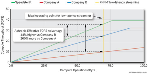 下圖顯示了一個有效TOPS的roofline模型,它使用了Achronix為微基準(GEMV和MLP)和測試而構(gòu)建的子集,以及公司A [4] [5]和公司B(基于架構(gòu))發(fā)布的數(shù)據(jù)。橙色的豎線表示批處理量為8毫秒和80毫秒音頻模塊的最佳操作點,用于低延遲、實時ASR數(shù)據(jù)流應(yīng)用。在這個最佳操作點上,Achronix的有效TOPS比公司A提高了44%,比公司B的解決方案提高了260%。