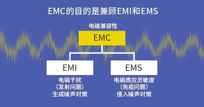 因此電子設(shè)備就同時需要具備防止自身產(chǎn)生噪聲的EMI (電磁干擾:Electro Magnetic Interference) 對策和防止自身受到影響的EMS (電磁敏感性: Electro Magnetic Susceptibility) 對策。這就叫做EMC (Electromagnetic Compatibility),即電磁兼容性。簡單來說,就是需要同時采取措施應(yīng)對Emission (發(fā)射) 問題和Immunity (免疫) 問題,即應(yīng)對生成噪聲和侵入噪聲,兼顧兩方面的方案就叫做EMC。