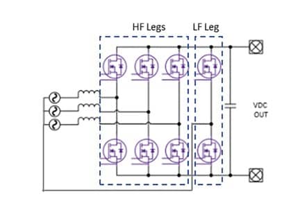 在許多歐洲家庭中,三相電源很容易獲得,但典型的美國家庭、亞洲和南美家庭只有標(biāo)準(zhǔn)的單相240 V。在這種情況下,設(shè)計(jì)需要大功率的22 kW OBC,它可以同時(shí)兼容單相和三相以減少OBC的數(shù)量。第四條橋臂被添加到傳統(tǒng)的三相PFC中,這樣設(shè)計(jì)人員就可以對單相輸入使用交錯(cuò)技術(shù)。圖7顯示了一個(gè)交錯(cuò)式圖騰柱PFC,它具有三個(gè)高頻橋臂和第四個(gè)低頻橋臂,每個(gè)PFC的高頻橋臂通過32 mΩ 1200 V SiC MOSFET提供6.6 kW的功率。低頻橋臂可以使用兩個(gè)Si IGBT來降低成本。當(dāng)三相可用時(shí),該電路可以自動(dòng)重新配置為三相工作,使第四條橋臂懸空不用。