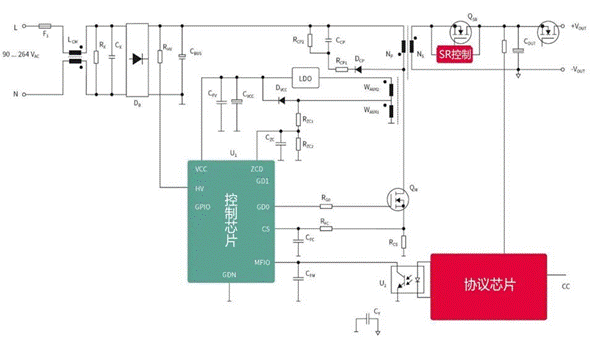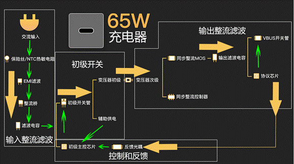 以某款65W單口手機(jī)充電器為例,主要包括輸入整流濾波、控制和反饋、初級開關(guān)、輸出同步整流,輸出濾波等四個部分組成,每個部分的詳細(xì)組成如圖1所示。