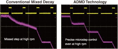 采用高級動態(tài)混合衰減(ADMD)技術(shù),動態(tài)調(diào)整混合衰減比例,優(yōu)化步進電機高速電流驅(qū)動。如下圖所示,在高速電流驅(qū)動狀態(tài)下,傳統(tǒng)的方式可能會發(fā)生失步現(xiàn)象(圖左),而ADMD則可以實現(xiàn)精準(zhǔn)的控制(圖右)。采用ADMD技術(shù)能夠?qū)崿F(xiàn)更緊密的輸入電流跟蹤,從而進一步強化了高轉(zhuǎn)速條件下的高效電機控制。
