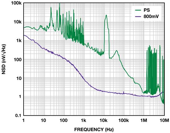 當(dāng)裕量電壓降至200 mV時(shí),隨著高頻PSRR接近0 dB,100 kHz以上的噪聲雜散開始穿過噪底。噪聲略升至10.8 μV rms。隨著裕量降至150 mV,整流諧波開始影響輸出噪聲,后者升至12μVrms。在大約250 kHz 處出現(xiàn)幅度適中的峰值,因而盡管總噪聲的增加量并不大,但敏感電路也可能受到不利影響。隨著裕量電壓進(jìn)一步下降,性能受到影響,與整流相關(guān)的雜散開始在噪聲頻譜中顯現(xiàn)出來。圖5所示為100-mV裕量條件下的輸出。噪聲已上升至12.5 μV rms。諧波所含能量極少,因此,雜散噪聲只是略有增加,為12.7 μV rms。