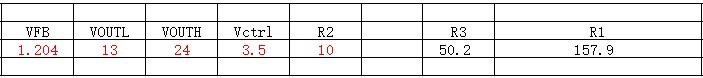 VOUTH=24,VOUTL=13,VFB=1.204,R2=10K,把相關(guān)參數(shù)填入以上表格,自動(dòng)計(jì)算出另外兩個(gè)匹配電阻: