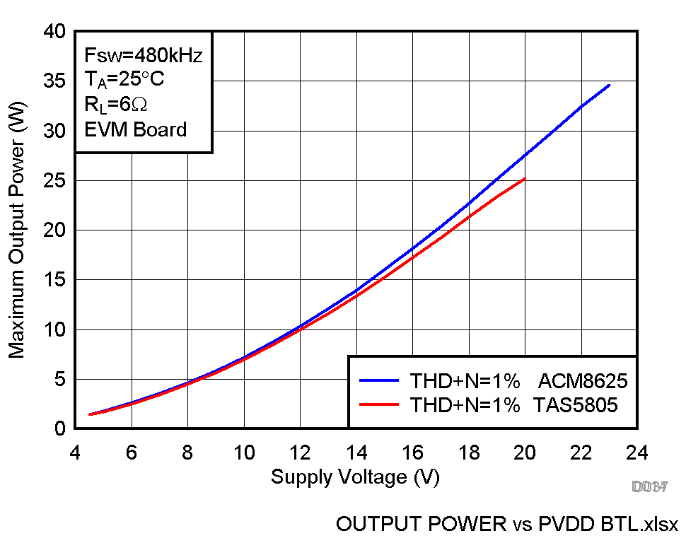 2×14W, 立體聲輸出(4Ω, 12V, THD+N = 1%); 2×10.5W, 立體聲輸出 (6Ω, 12V, THD+N = 1%) |