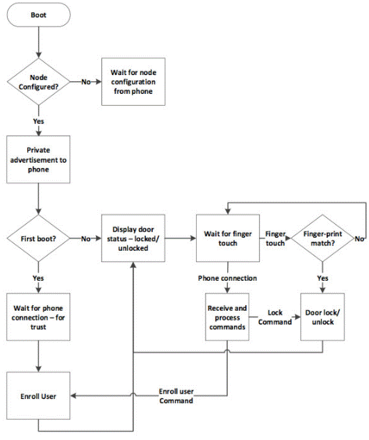 房間控制和監(jiān)控:房間控制節(jié)點允許用戶控制房間內(nèi)的照明、恒溫器和其他電器。它們還可以監(jiān)控環(huán)境參數(shù),如溫度、濕度。這些節(jié)點可以通過智能手機和/或節(jié)點中存在的本地控件進行控制。例如,圖3所示的系統(tǒng)包括兩個光控制節(jié)點和一個溫度監(jiān)測節(jié)點。此外,光控制節(jié)點支持基于用戶識別的智能控制。例如,可以將節(jié)點配置為在使用經(jīng)過身份驗證的指紋解鎖房屋門時打開燈。同樣,當(dāng)有人離開時,當(dāng)門被鎖上時,燈可以關(guān)閉。