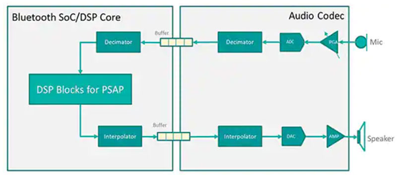 一個(gè)典型的音頻 PSAP 系統(tǒng)包括一個(gè)音頻編解碼器和 DSP 核心。這個(gè) PSAP 音頻系統(tǒng)有一個(gè)音頻編解碼器和一個(gè)連接模數(shù)轉(zhuǎn)換器 (ADC) 的麥克風(fēng)輸入簡化視圖。音頻編解碼器對(duì) ADC 的數(shù)字輸出進(jìn)行解碼,為向藍(lán)牙片上系統(tǒng) (SoC)/DSP 內(nèi)核進(jìn)行數(shù)字傳輸做準(zhǔn)備(圖 2)。