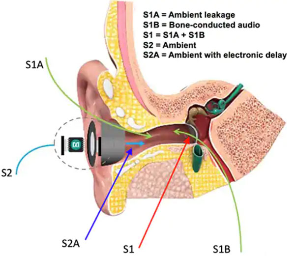 這個(gè)激活的 PSAP 有兩種類型聲音到達(dá)用戶的耳膜。S1 是殘留的用戶語音環(huán)境泄漏 (S1A) 和骨傳導(dǎo) (S1B) 聲音的疊加。對(duì)于 S1 來說,耳穿戴設(shè)備遮住了耳朵的開口,以阻止聲音到達(dá)內(nèi)部和逃出耳道之外(圖 3)。