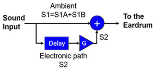 PSAP 的麥克風(fēng)捕捉環(huán)境聲音 (S2) ,DSP 對(duì)其進(jìn)行處理,輸出信號(hào) (S2A) 通過音頻換能器送入耳道。重要的是,音頻處理鏈的設(shè)計(jì)產(chǎn)生了一個(gè)延遲。這三個(gè)聲音匯集到用戶的耳膜,產(chǎn)生了 PSAP 體驗(yàn)。