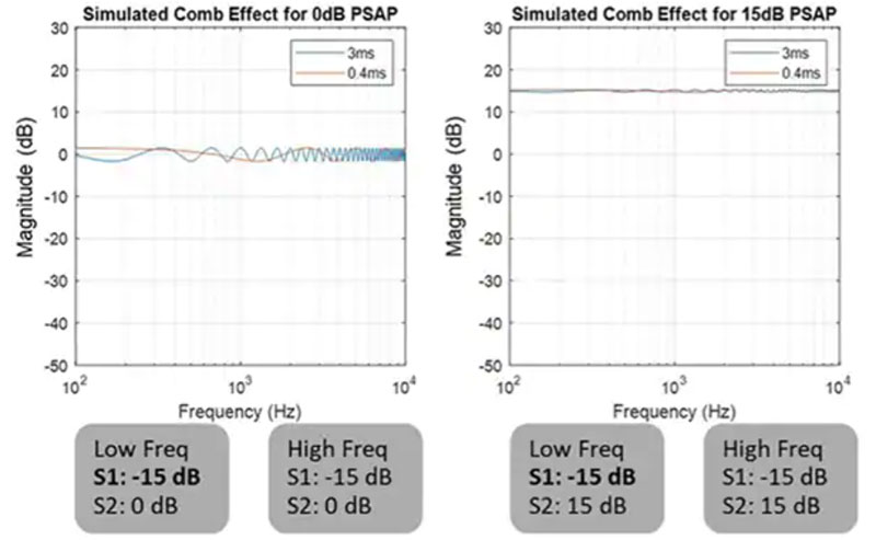 圖 4 中的變量有延遲和增益 (G)。S1 信號(hào)直接進(jìn)入耳膜。通過將環(huán)境中的 S1 聲音添加到電子 S2 路徑中,S2 中的增益功能就會(huì)產(chǎn)生一個(gè)延遲。S1 和 S2 的加入有可能產(chǎn)生回聲,但這可以通過操縱延遲時(shí)間和增益大小來減少。