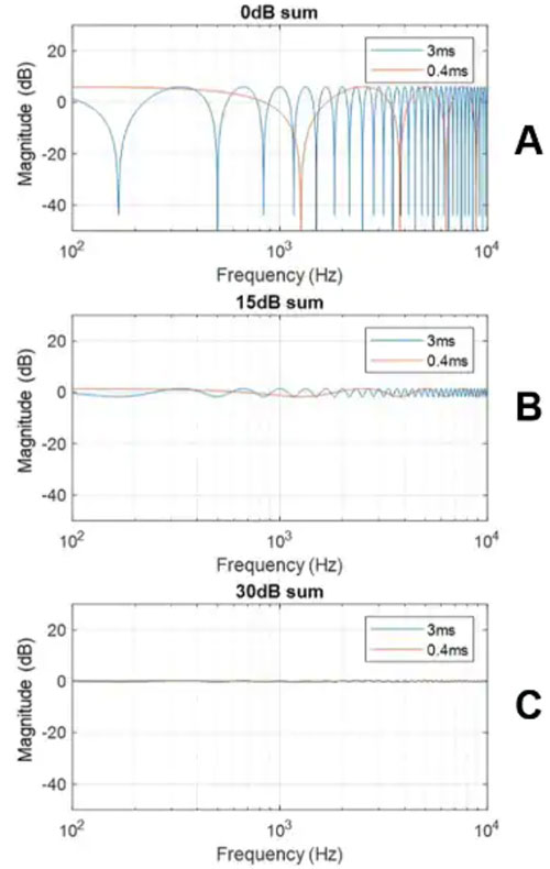 圖 5:基于信號(hào)模型的兩個(gè)聲音的疊加頻率響應(yīng),延遲變化從 0.4 ms 到 3 ms,增益變化為 0dB、15dB 和 30dB。(圖片來源:Maxim Integrated,由 Bonnie Baker 修改)