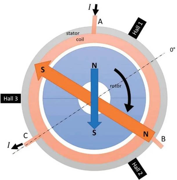 圖 2 :無槽無刷直流電機(jī)的橫截面示意圖。藍(lán)色 區(qū)域是帶有兩極永磁體的轉(zhuǎn)子。磁鐵產(chǎn)生的磁場 由藍(lán)色箭頭表示。橙色區(qū)域?yàn)槿嗬@組。當(dāng)電流 從 A 相流向 C 相時會產(chǎn)生磁場,由橙色箭頭表 示,以便于簡化。當(dāng)兩個箭頭對齊時,轉(zhuǎn)子將旋 轉(zhuǎn)。驅(qū)動器變換相位(旋轉(zhuǎn)定子磁場,橙色箭頭), 以確保定子和轉(zhuǎn)子磁場之間盡可能保持 90 度(產(chǎn) 生最大扭矩)。