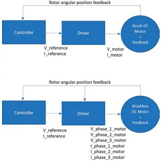 圖 5:有刷直流電機(jī)和無刷直流電機(jī)之間的運(yùn)動控制架構(gòu)比較。