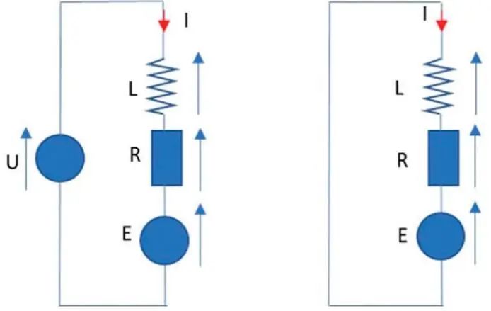直流電機(jī)的特點(diǎn)是電感L、電阻R 和反電動勢E 串聯(lián)。反電動勢是由磁感應(yīng)(法拉第- 楞次感應(yīng)定律)產(chǎn)生的電壓,它與施加的電壓相反,并且與電機(jī)速度成正比。圖8 顯示了PWM 接通和PWM 斷開時的電機(jī)。