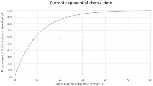現(xiàn)在,為了簡單起見,我們不考慮反電動勢。當(dāng)向R L 電路施加電壓或切斷電壓時,電感器將阻止電流的變化。向R L 電路施加電壓U,電流將遵循一階指數(shù)上升,其動態(tài)取決于由L / R 比決定的電時間常數(shù)τ(圖9)。在經(jīng)過5 倍時間常數(shù)后,它將逐漸達(dá)到穩(wěn)態(tài)值,即99.7%的U/R。